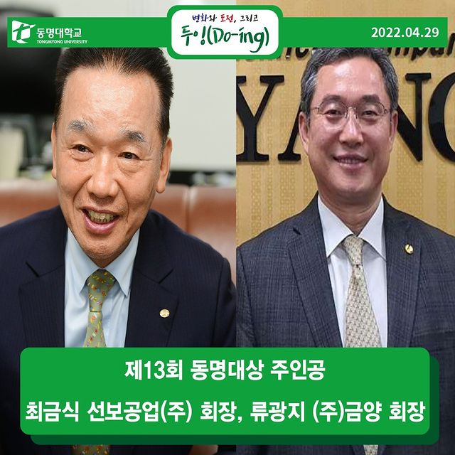 도전·창의·봉사를 실천해온 인사에 수여하는 공익성 포상 동명대상의 제13회 주인공(산업분야)에 최금식 선보공업(주) 회장, 류광지 ㈜금양 회장이 선정