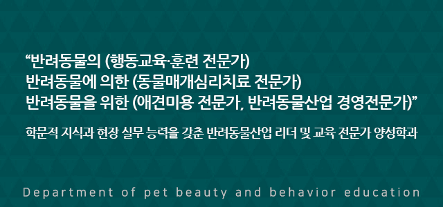 이에 학문적 지식뿐만 아니라 산업현장에 바로 적용할 수 있도록 이론과 경험을 기반으로 실무중심의 커리큘럼과 현장실습 수업을 통하여 반려동물 교육전문가 및 반려동물 산업 실무형 인재를 양성합니다.