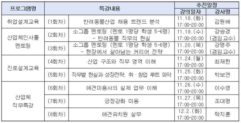 11/18(화) ~ 12/2(화) 반려동물미용&행동 직무연계 로드맵(전문가 특강) 참여 신청 안내 (~11/13(목) 23:59까지 신청)