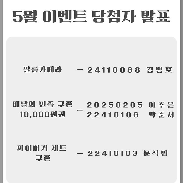 경품은 5월 19일(월) 오후 13시 과방에서 수령 가능합니다.