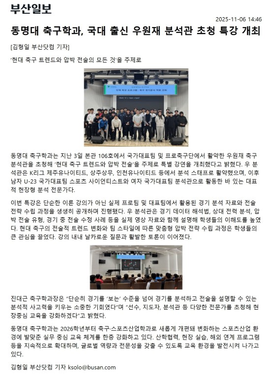 2025년 11월 3일 월요일 오전 10시 U-23세 남자 국가대표팀, 제주,김천,인천 등 프로 축구단 우원재 전력분석관 특강