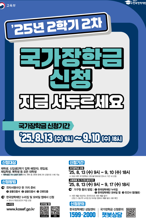 2025-2학기 국가장학금 2차 신청 안내(8/13(월) 9:00 ~ 9/10(수) 18:00)