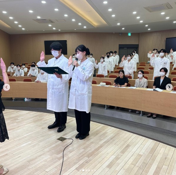 단정한 복장과 가운을 입고 선서식을 진행하여 치료실습