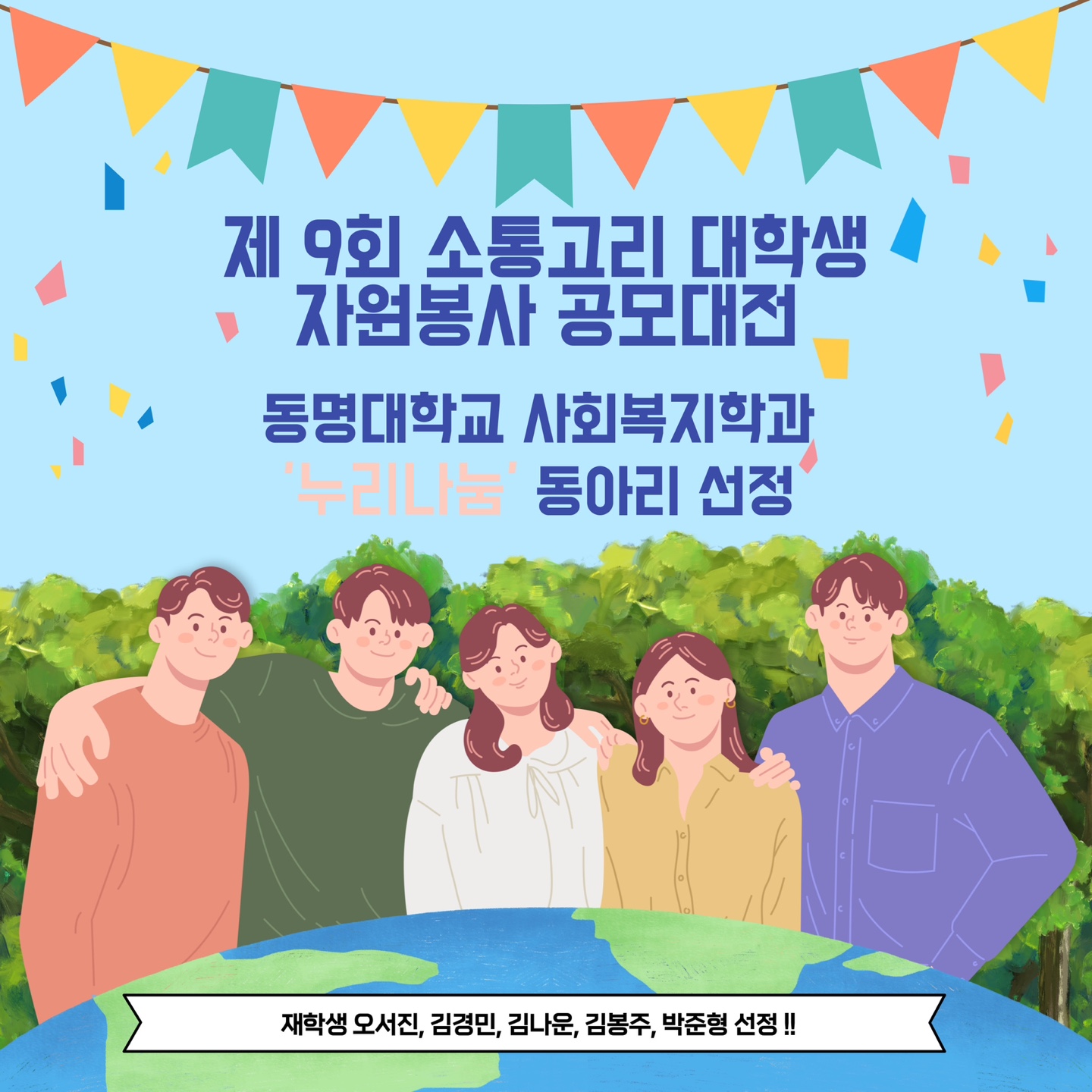 제9회 소통고리 대학생 자원봉사 공모대전 수상〈지역 내 취약계층 아동을 대상으로 창작 및 실천 기회 제공을 통한 지역사회 환경인식 향상 프로그램 "환경을 누리고 온기 / 온정을 나누리"〉 - 2022.08.