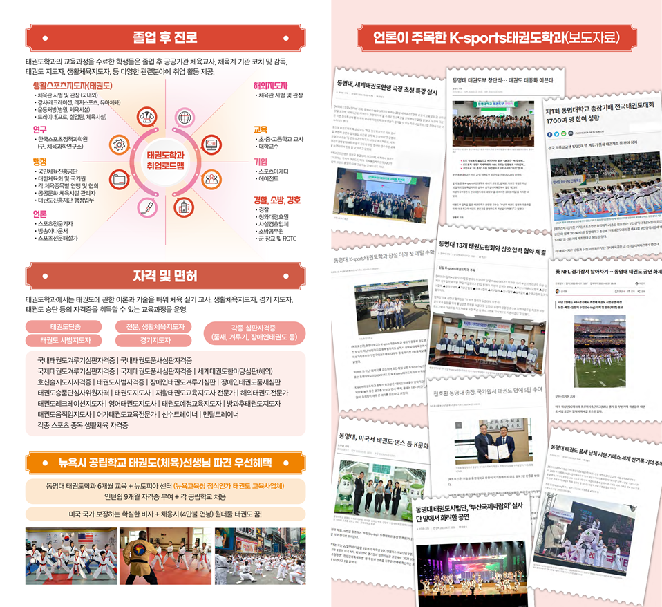 - 일반 태권도학과는 상상할 수 없는 흥미진진한 체험과 신나는 모험을 경험할 수 있으며 도전하고 상상하는 것을 모두 이룰 수 있는 학과