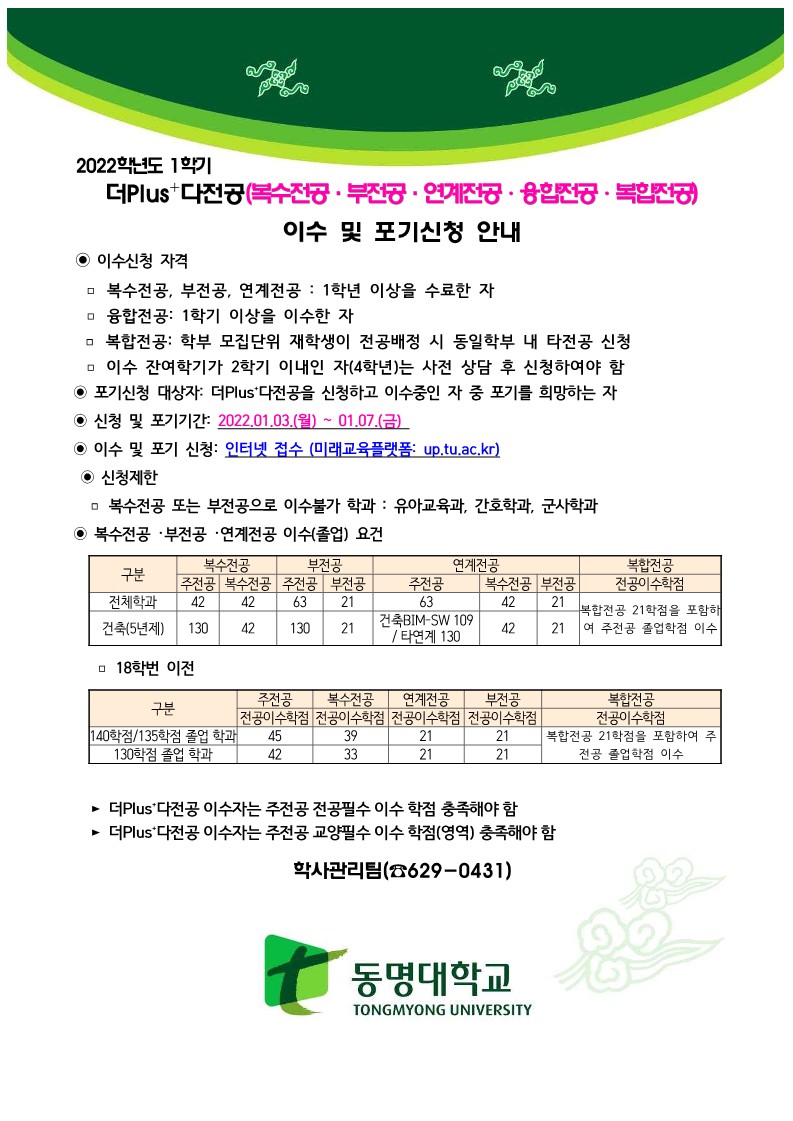 2022학년도 1학기 더PLUS⁺다전공(복수/부/연계/융합/복합) 이수 및 포기신청 안내