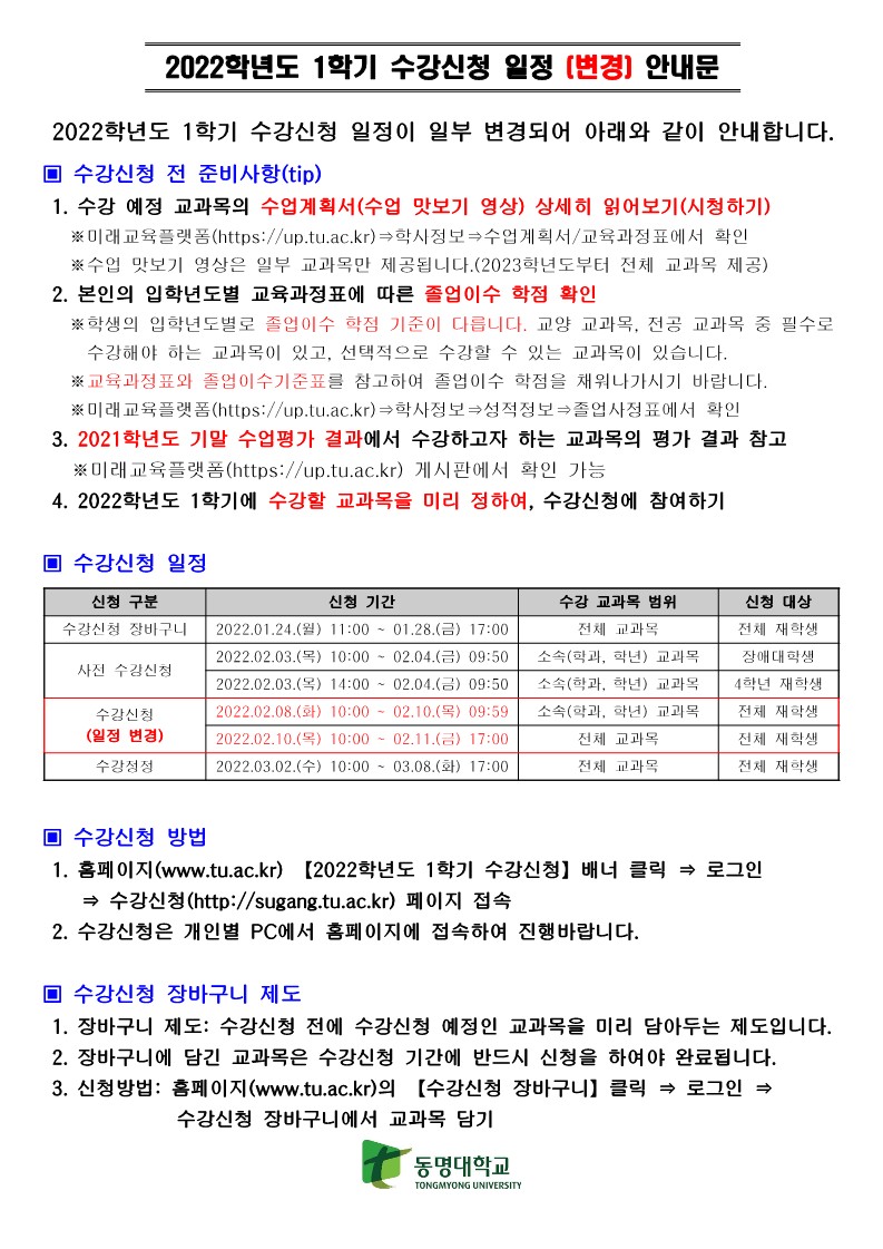 2022학년도 1학기 수강신청 안내(변경)